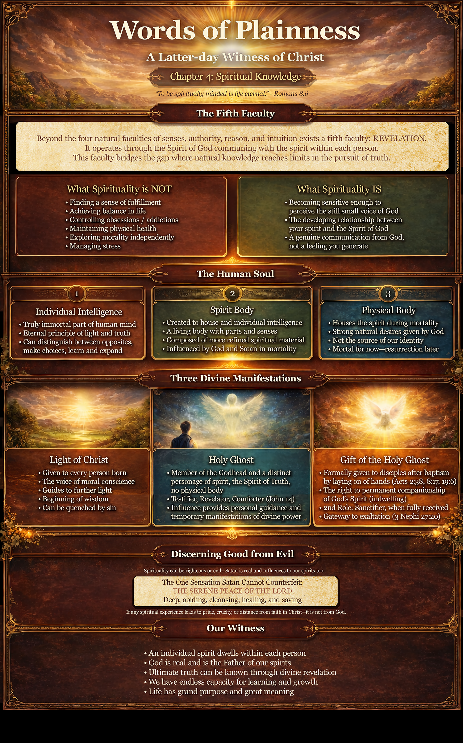 A note of clarification may serve seekers from other Christian traditions. Many Christians use the word soul to describe what Latter-day Saints would call the spirit—the whole immaterial self. In our understanding, however, the terms are distinct. The spirit is the individual, intelligent personality—a literal offspring of God who existed before birth and will persist after death. The soul is what comes into being when that spirit is joined to a body of flesh: two natures, two creations of God, united into one being for a mortal season (Genesis 2:7). It is the spirit within the flesh that possesses the faculty of revelation—the fifth faculty—through which God communes with His children. This distinction matters because it is not the body alone, nor some vague inner self, but the literal spirit offspring of God within you that can perceive His voice.